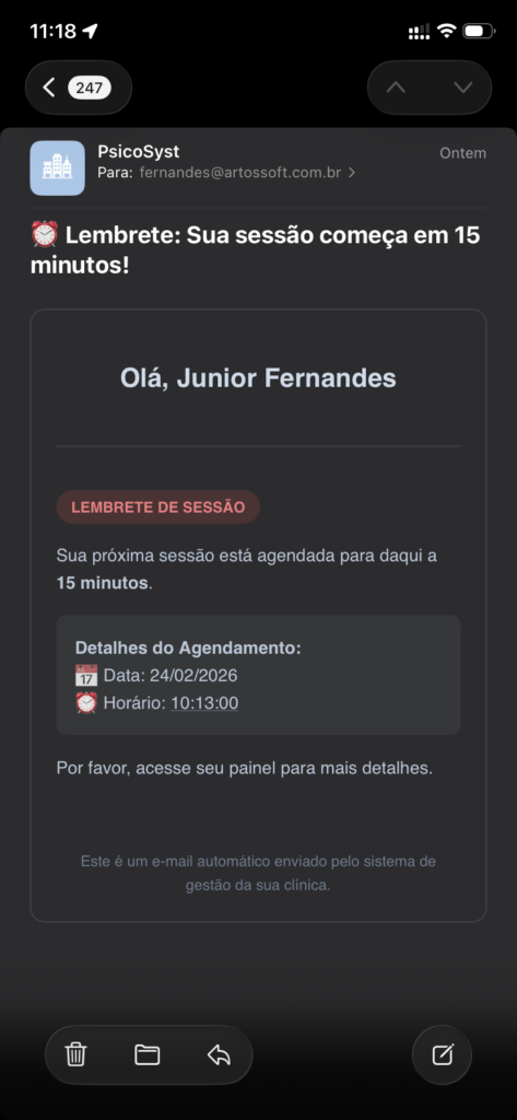 Sabemos que a rotina pode ser agitada, e um lembrete gentil faz toda a diferença na jornada de quem busca bem-estar. Com os lembretes por e-mail do PsicoSyst, você recebe todos os detalhes do atendimento de forma profissional e organizada.